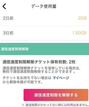 これまで、3日間5GB利用による通信速度制限の解除は「マイページ」から申請を出していました。